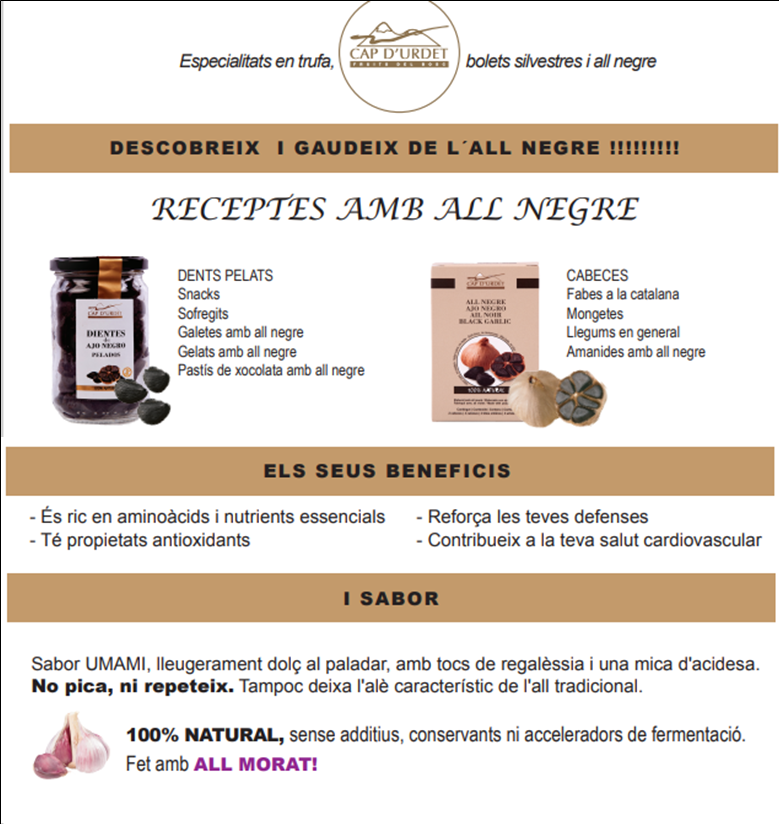 L'all negre és un producte ideal per acompanyar formatges i vins, amanides, pastes, peixos, carns, sofregits, guisats, salses, postres, en dejú o com a snack. Sabor UMAMI, lleugerament dolç al paladar, amb tocs de regalèssia, panses, fumat i una mica d'acidesa.