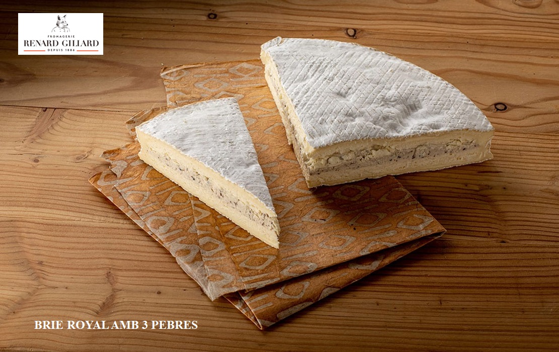 Brie Royal amb 3 pebres Renard Gillard: Brie elaborat amb llet pasteuritzada de vaca, i amb farcit de 3 pebres. Una textura cremosa amb el toc picant dels pebres.